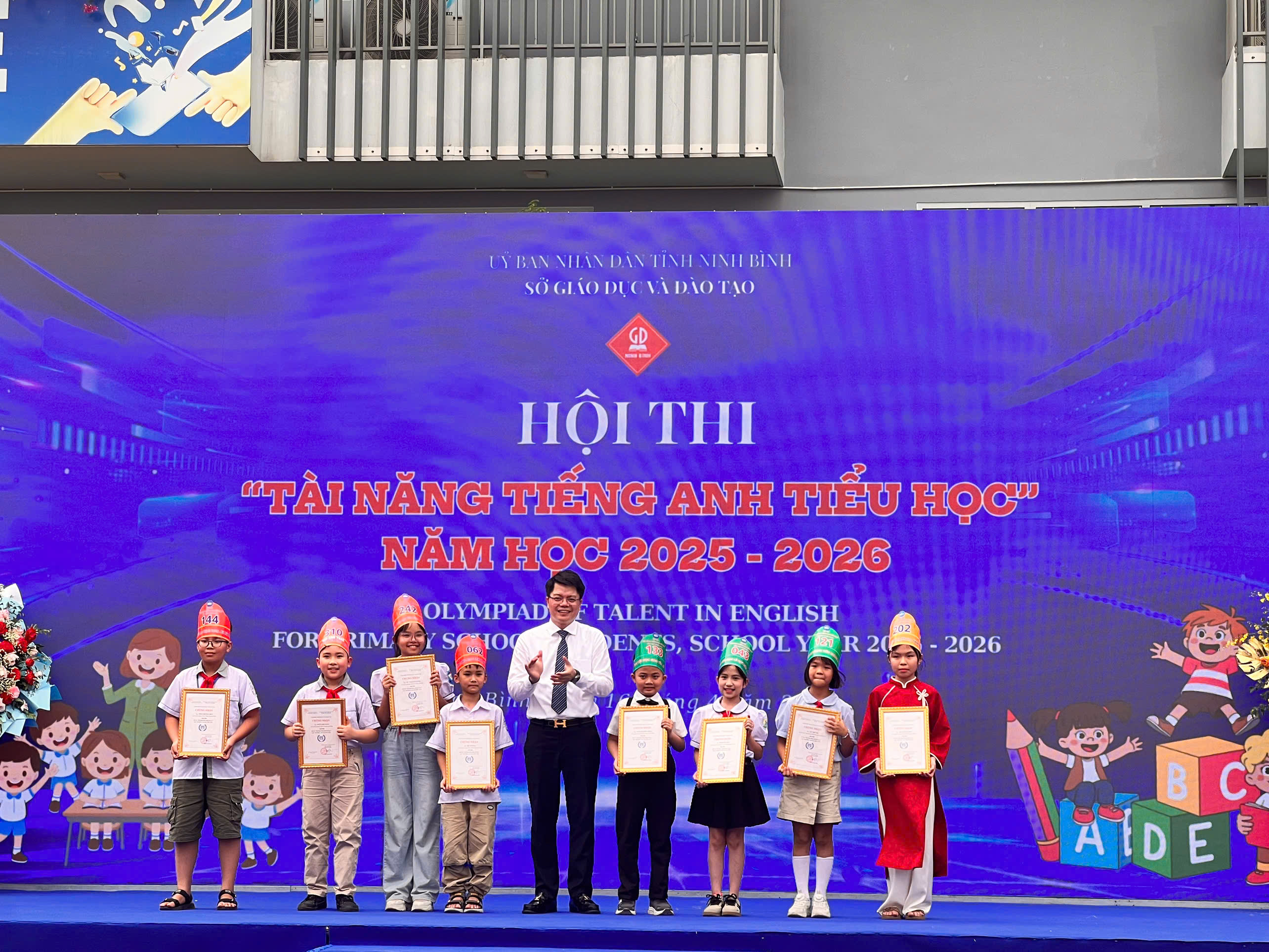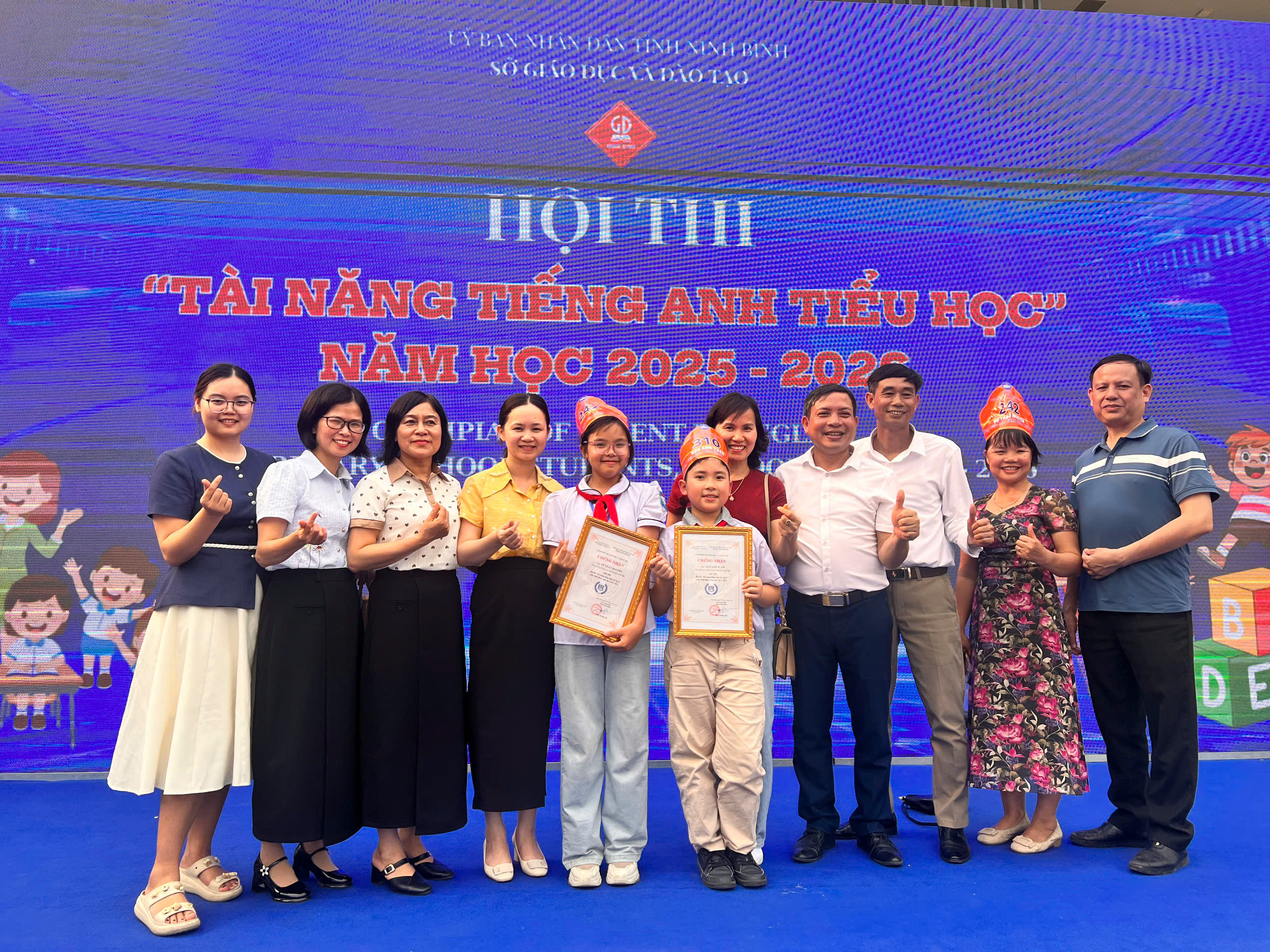 Chúc mừng thành tích của 2 em: Vũ Thảo Nguyên lớp 5A và Ngô Anh Tuấn lớp 4B trong Hội thi Tài năng Tiếng Anh cấp Tiểu học năm học 2025-2026 do Sở giáo dục tỉnh Ninh Bình tổ chức. Hai em đã vượt qua các vòng thi để lọt vào vòng chung kết và đã mang về 2 giải Nhất trong tổng số 8 giải Nhất của cấp Tiểu học tỉnh Ninh Bình. Một thành tích đáng tự hào.